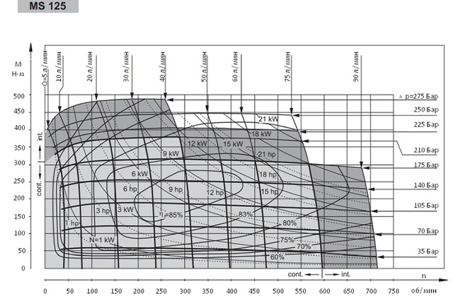 Гидравлический мотор с героторной парой, рабочий объем 125.7 см3/об. Частота вращения двигателя составляет 600 об/мин, при этом необходимо создать подачу масла в 75 л/мин соответственно. Рабочее давление 230 бар, при этом мощность на валу – 18 кВт. Следует обратить внимание, что максимальное рабочее давление и допустимый перепад давления на входе и выходе двигателя могут отличаться, поэтому в некоторых случаях необходимо обеспечить подпор на сливе из двигателя. Максимальный крутящий момент – 310 Н*м. Мотор хорошо реализует свои параметры при использовании минерального гидравлического масла. Вес гидромотора – 10.4 кг.