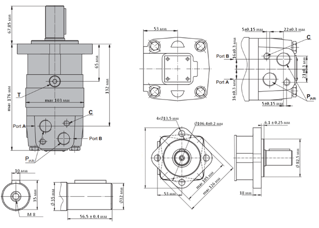 BM3Y125P10AYT11 имеет квадратный фланец на 4 отверстия крепления (диаметром 13,5 мм) с межосевым расстоянием 106,4 мм. Диаметр замка фланца 82,5мм. Вал – цилиндрический под призматическую шпонку, диаметр 32 мм, длина вала 56,5 мм. Присоединение в линию осуществляется с помощью резьбовых боковых портов – напорные порты G1/2” BSP, а порт слива масла в бак – G1/4” BSP. Есть возможность присоединиться к линии с помощью фланцев.
