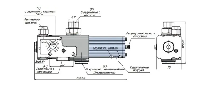 FRH 180 имеет длину корпуса 283,50 мм. Высота корпуса с портом для подсоединения насоса – 127,50 мм. Ширина корпуса составляет 75 мм. Порт для подсоединения к насосу имеет резьбу G 1”. Порт для подсоединения к баку имеет резьбу G 1/2”.