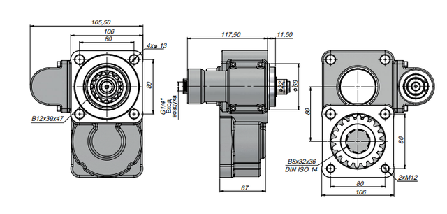 ZF PTO 01 имеет крепление на 4 отверстия диаметром 13 мм. Межосевое расстояние между отверстиями 80х80 мм. Высота корпуса – 165.5 мм. Длина корпуса – 117.5 мм.