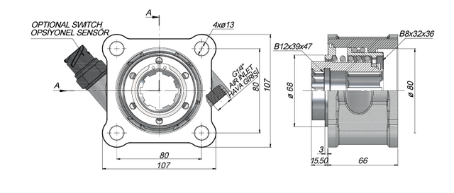 ZF PTO 07 имеет крепление на 4 отверстия диаметром 13 мм. Межосевое расстояние между отверстиями 80х80 мм. Ширина корпуса – 81.5 мм. Высота корпуса – 107 мм. Длина корпуса – 107 мм.