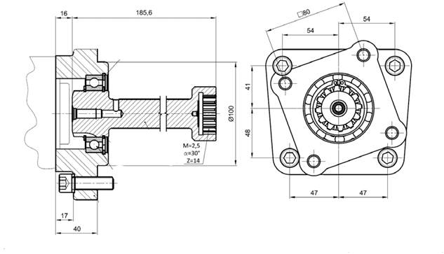 Приєднувальні розміри вала відбору з плитою VK19004 для гідросистеми