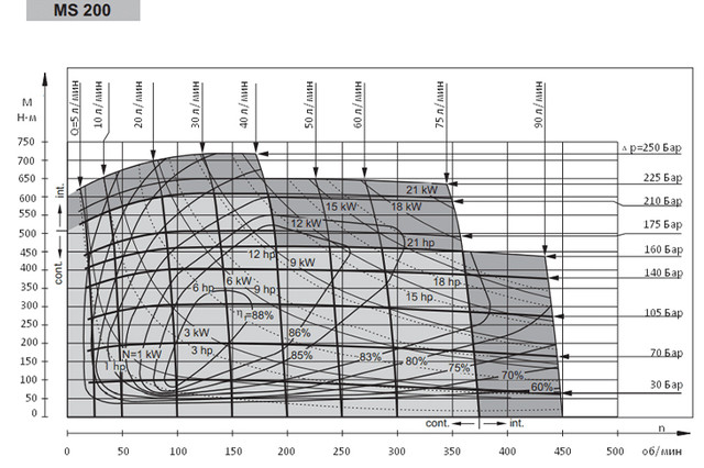 Гідравлічний мотор з героторною парою, робочий об’єм 200 см3/об. Частота обертання мотору становить 375 об/хв, при цьому необхідно створити подачу масла в 75 л/хв відповідно. Робочий тиск 205 бар, при цьому потужність на валу – 16.5 кВт. Варто звернути увагу, що максимальний робочий тиск та допустимий перепад тиску на вході та виході мотору можуть відрізняються, тому в деяких випадках необхідно забезпечити підпор на зливі з мотору. Максимальний крутний момент - 564 Н*м. Мотор добре реалізує свої робочі параметри при використанні мінерального гідравлічного масла. Вага гідромотору – 11.2 кг.