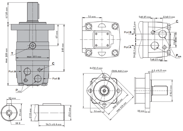 BM3Y200P10AYT11 має квадратний фланець на 4 отвори кріплення (діаметром 13,5 мм) з міжосьовою відстанню 106,4 мм. Діаметр замка фланця 82,5 мм. Вал – циліндричний під призматичну шпонку, діаметр 32 мм, довжина валу 56,5 мм. Приєднання в лінію здійснюється за допомогою різьбових бокових портів – напірні порти G1/2” BSP, а порт зливу масла в бак – G1/4” BSP. Є можливість приєднатися в лінію за допомогою фланців.