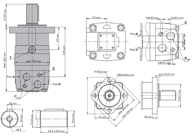 MS160C має квадратний кріпильний фланець на 4 отвори кріплення діаметром 13,5 мм. Міжосьова відстань між отворами складає 106,4 мм. Діаметр замка фланця - 82,5 мм. Вал мотору – циліндричний під призматичну шпонку, діаметр – 32 мм. Довжина валу (від торця до фаски) становить 56,5 мм. Приєднувальні порти знаходяться збоку на корпусі мотору. Підключення до портів тиску, може здійснюватися двома способами: фланцем або різьбовим адаптером G1/2” BSP. Зливний порт різьбовий, знаходиться також збоку на корпусі та має різьбу – G1/4” BSP.
