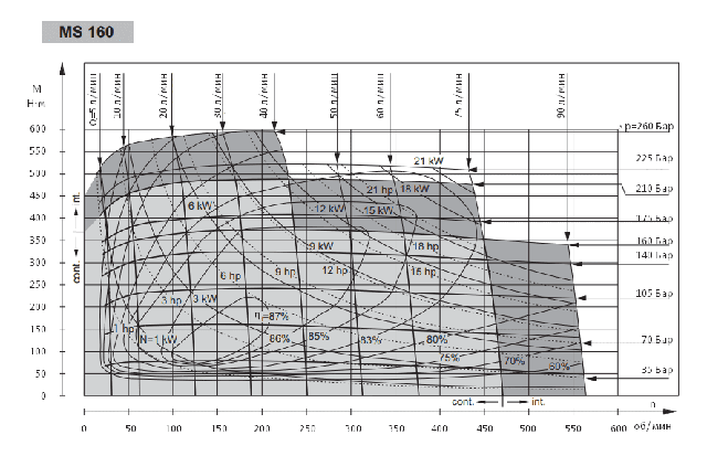 Гідравлічний мотор з героторною парою, робочий об’єм 159.7 см3/об. Частота обертання мотору становить 470-560 об/хв, при цьому необхідно створити подачу масла в 75-90 л/хв відповідно. Робочий тиск від 230 до 300 бар, потужність гідромотору – 16.5-23 кВт. Мотор добре реалізує свої робочі параметри при використанні мінерального гідравлічного масла та робочої температури його від -40 до 140℃. Вага гідромотору – 10.8 кг.
