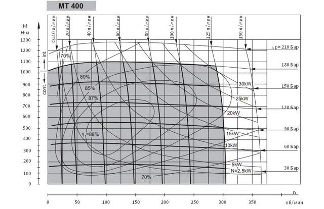 Гідравлічний мотор з героторною парою, робочий об’єм 410.9 см3/об. Максимальна частота обертання мотору становить 304 об/хв, при цьому необхідно створити подачу масла в 125 л/хв відповідно. Робочий тиск до 210 бар, максимальна потужність на валу – 30 кВт. Мотор добре реалізує свої робочі параметри при використанні мінерального гідравлічного масла та робочої температури його від -40 до 140℃. Вага гідромотору – 23 кг.