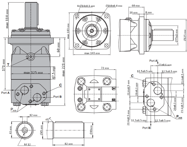 MT400C стандартного виконання має квадратний фланець на 4 кріпильних отвори діаметром 14 мм, міжосьова відстань яких складає 112 мм. Габарити фланця 143х143 мм. Діаметр замка фланця – 125 мм. Вал мотору циліндричний, діаметром 40 мм під призматичну шпонку. Довжина валу – 82 мм. Приєднування мотору в лінію можна здійснити як за допомогою фланців (кріплення болтами М10 10 мм), так і різьбових адаптерів. Порти тиску мають різьбу G3/4” BSP, а порт зливу масла в бак - G1/4” BSP.