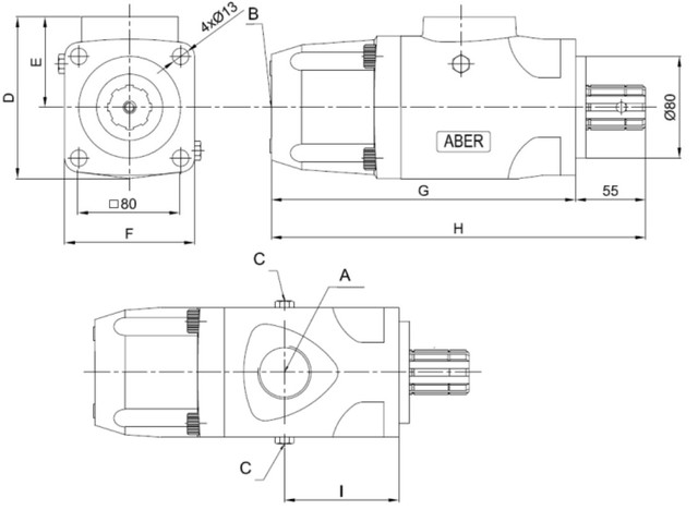 Як говорилося вище, насос встановлюється на КВП, тому приєднувальний фланець квадратного типу на 4 отвори кріплення, діаметром 13 мм. Міжосьова відстань між отворами складає 80х80 мм. Діаметр замка фланця становить 80 мм. Вал – шліцьовий, В8х32х36 (8 шліців, діаметр валу 36 мм), виконано за стандартом DIN 5462. Приєднання в систему різьбове, за допомогою фітингів. Всмоктувальний отвір – 1 1/2” BSP, а порт тиску – 1” BSP.