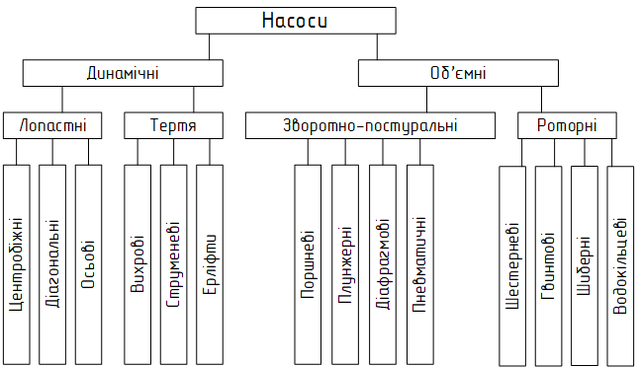 Класифікація гідронасосів – це складне і неоднозначне завдання, оскільки існує багато їх типів. Насоси класифікують за низкою ознак: за призначенням, принципом дії, сферою застосування, величиною подачі та напору. Стисла їх характеристика наведена на мал.1.